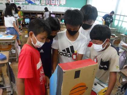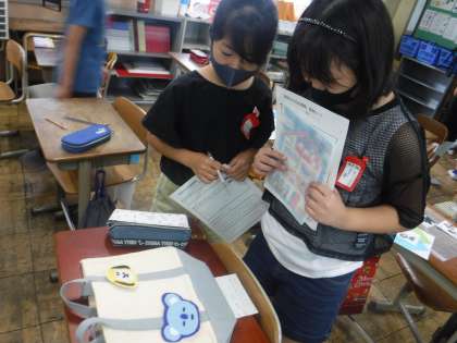 夏休みに取り組んできた自由研究・作品の交流会をしました。まず初めはクラスで交流し,その後学年で交流しました。友達の作品を見ながら,「この色使いきれい」「こんな風にして作ったらいいんだ」と良さを見つけていました。