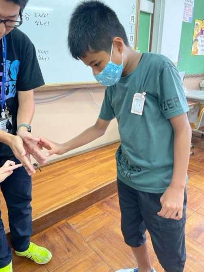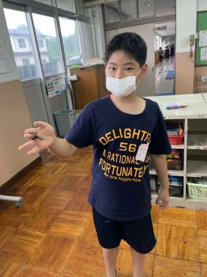 昆虫が苦手だと感じている子が多いです。しかし,めずらしくシオカラトンボが校舎内に迷い込んで来たため,先生が捕まえました。