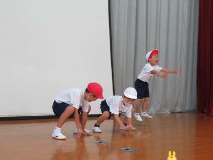準備体操の後は、元気いっぱいな曲『mela!』のダンスを練習しました。先生のまねっこをして、はいポーズ!かっこいいヒーローになりきって踊りました。