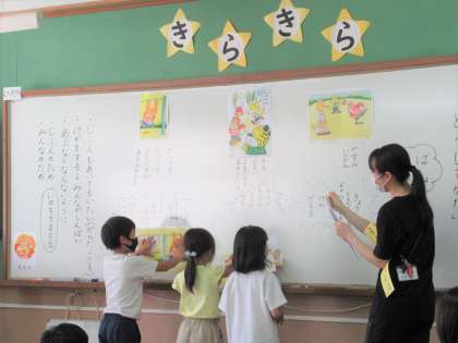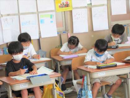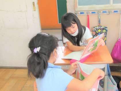 みんな、挿絵を見て一生懸命発表します。友だちとは、きまりを守らないといけない理由を一生懸命話し合う様子が見られました。
