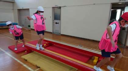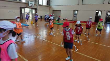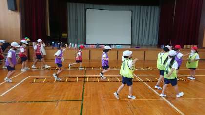 体育で“なげあそび”と一緒に“まねっこあそび”にも取り組んでいます。マットやラダー,平均台やケンパゾーンなどいろいろな場に行き,リーダーがする動きを真似して進んでいきます。くるくる回ったり,片足で進んだり,色々な動きを全身で頑張っていました。終わると「疲れたー。でも,もっとやりたい。」と楽しみながら運動に取り組めています。