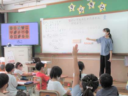 写真は『10より大きな数』の引き算の学習の様子です。数図ブロックを使って、みんなで答えの出し方を考えていきました。
