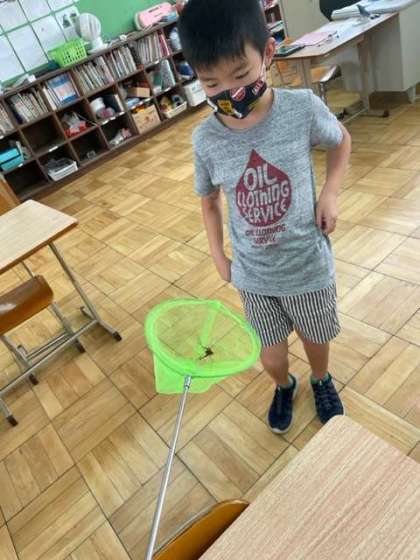 今朝,むくのきの廊下の前にカマドウマがいたので,虫取り網で捕まえ,みんなでどんな虫なのかを観察しました。