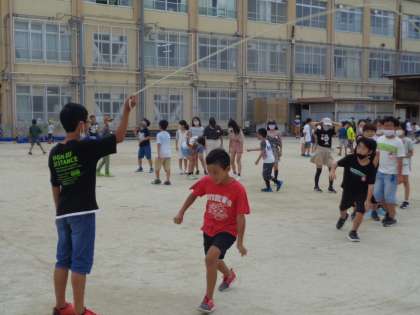 5年生は,スポーツチャレンジ大会に参加しています。3分間で大縄跳びの八の字が何回跳べるかにチャレンジしています。各クラス,クラスみんなで協力して頑張っています。