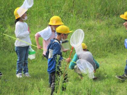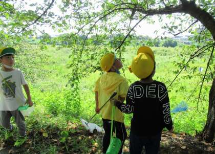 桂川の河川敷には草が茂っていて、耳をすますと様々な虫の鳴き声が聞こえます。草むらや木の上、グループで思い思いの場所を探索し、バッタや蝶、トンボなど多くの虫を見つけることができました。