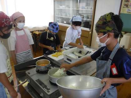 「これは水からゆでるの?」と声をかけあいながら進めています。包丁を持つときには,猫の手を意識して安全に使用することができました。