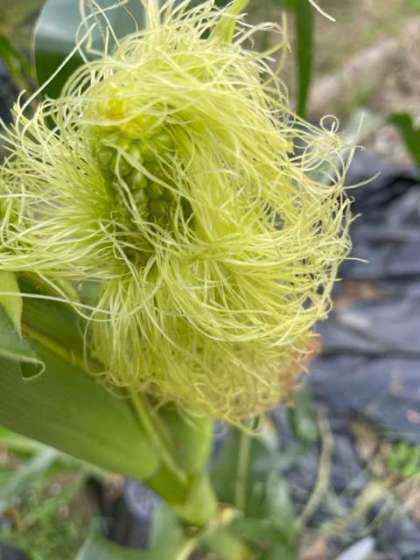 むくのきの畑で育てているとうもろこしの実が大きくなり,毛の中から種が「こんにちわ」と顔を出していました。