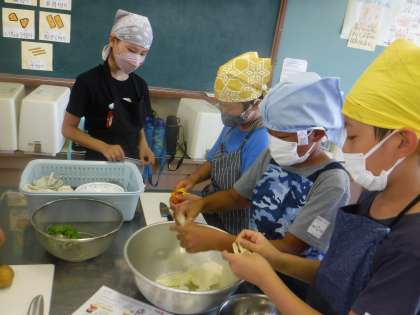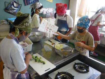 家庭科でゆで野菜サラダを作りました。グループで分担して,活動しています。