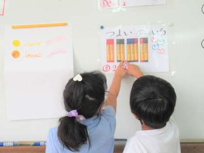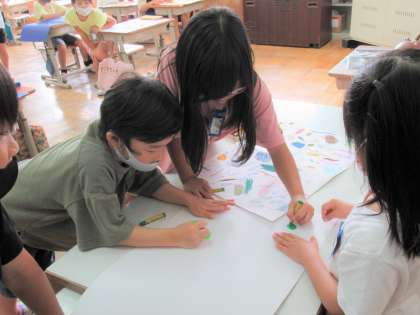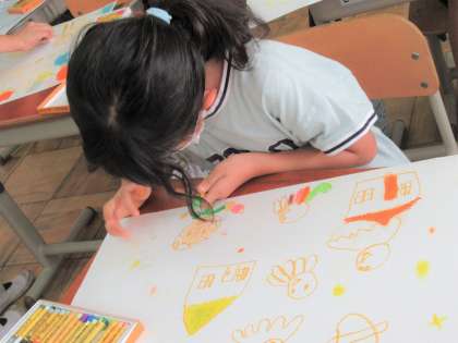 色塗りの際には、塗り方もいろいろ工夫している様子が見られました。重ね塗りを試してみたり、指でクレパスを広げてみたり……面白い工夫がたくさんです!とっても上手く自分の絵のイメージに生かしていました。