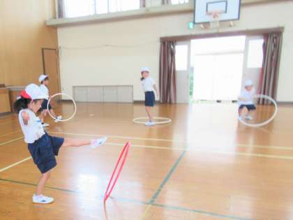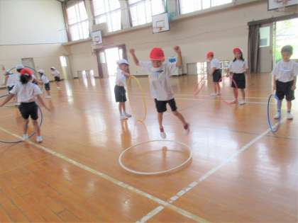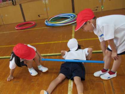 1年生体育科の『用具遊び』では、輪や棒を使った遊びを楽しみました。初めに先生が簡単な遊びを紹介した後に、それぞれ教えてもらった遊びを楽しみながら、新しい遊び方を工夫します。