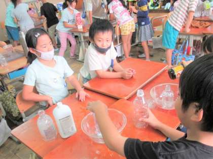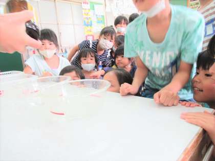 写真は、同じ大きさの容器に入れてかさを比べる方法と、容器の片方に水を入れて直接入れ替えて比べる方法を試している様子です。実践的な活動で、とっても楽しんで取り組むことができました。