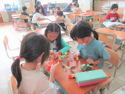 5年生の「会社」の活動を見て、1年生も自分たちの係活動への意欲が高まっている様子です。工作を楽しんだり、図鑑で作り方や生き物のことを調べたり、生き生きと活動しています。発表の計画を立てている係もあるようです。とっても楽しみですね!