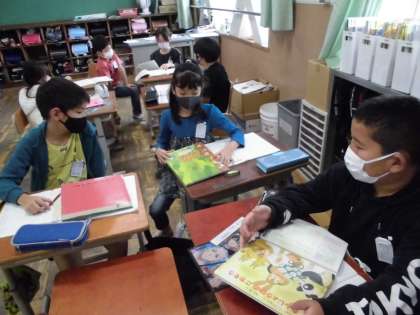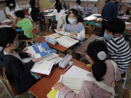 国語科の学習では、役割を決めて、まとめる話し合いをしています。