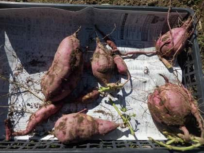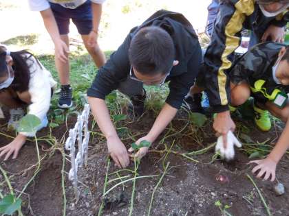協力して取ったお芋です。少し乾かして,またみんなで調理ができたらいいなと思っています。さつまいも掘りのあとの算数の学習では,はかりを出してお芋の重さをみんなで量りました。