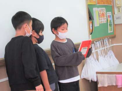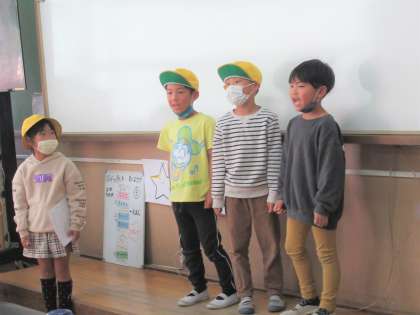 1年生の係活動の続報です。先週から今週にかけ、係活動の発表の機会が増えています。写真は、クイズ係と生き物係の発表の様子です。クイズをしたり、紹介があったり、子どもたちが生き生きと活動している様子を見ると、とても嬉しいなと思います。