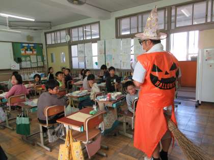 給食調理員さんがハロウィーンの仮装をして,各教室まで届けてくれました。