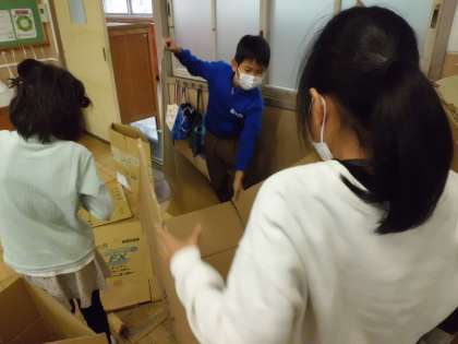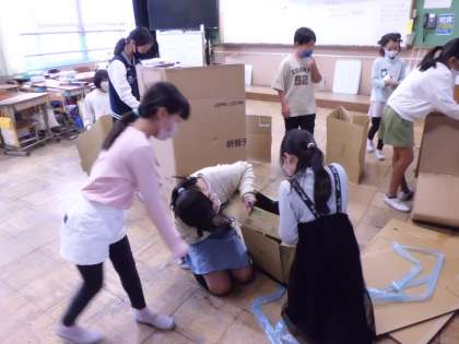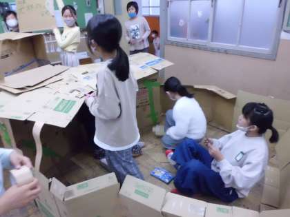 大きな段ボールを組み立てるのはなかなか難しそうでしたが,壁を利用したり机などを利用したりと,工夫して上手く組み立てることができました。