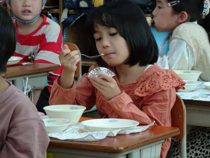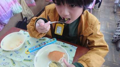 給食時間に1人1つずつですが食べました。「あまくておいしい。もっと食べたい。」「お芋の味がしておいしい。」など自分たちの手で育てたお芋をおいしくいただきました。また感想を聞いてみてください。