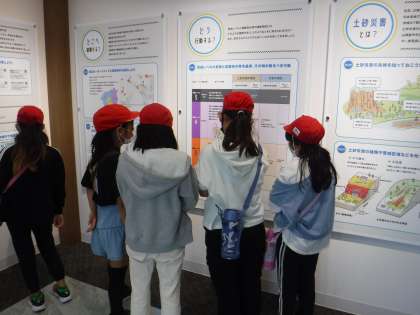 次は土砂災害を体験するコーナーです。アニメ仕立ての映像をみたり,防災マップなどを見ながら土砂災害が起きたときにはどのようにすればよいのかを学びました。