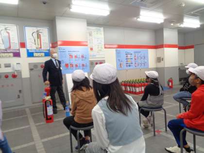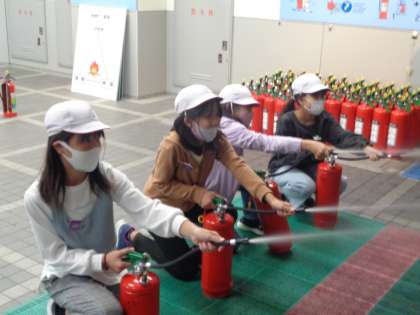 火事が起きた時の対処方法を学びました。消火器を使った、火を消す体験もさせていただきました。