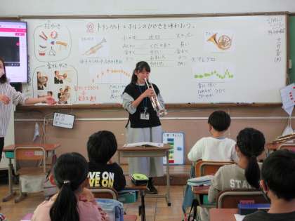 今日の音楽の学習では,スペシャルゲストで2年生の中島先生がトランペットとホルンを吹きに来てくれました。はじめて生で聴く金管楽器の音色をとても楽しんでいました。