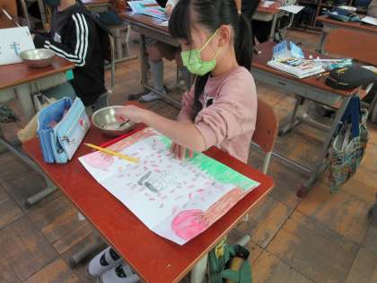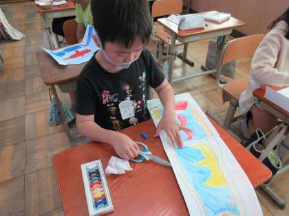 図画工作科の学習では,「ひらいてひろがるふじぎなせかい」に取り組んでいます。