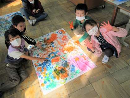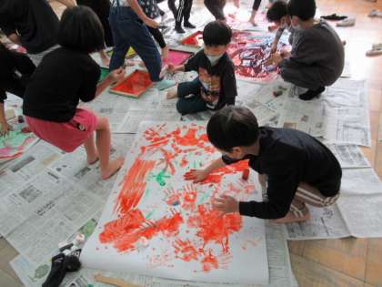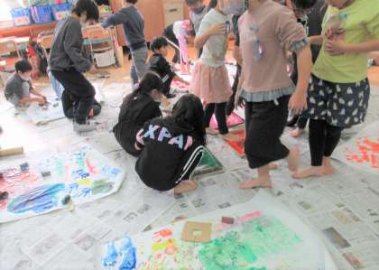 図画工作科『ぺったんコロコロ』では、ローラーやスポンジを使って模造紙いっぱいに形をうつしていきました。各グループに1枚の模造紙なので、子どもたちは体全体をいっぱい使って、いろいろな模様を描くことができました。どんな模様になったかな?
