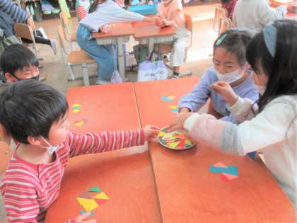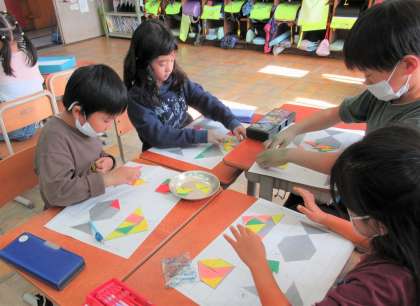 算数科の『かたちづくり』の学習では、三角形の色板を使って色々な形作りにチャレンジしています。三角形の向き、合わせる辺……少し違うと大違い!まるでクイズのように楽しんで学習に取り組んでいる子どもたちです。