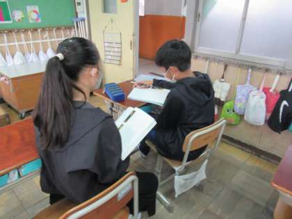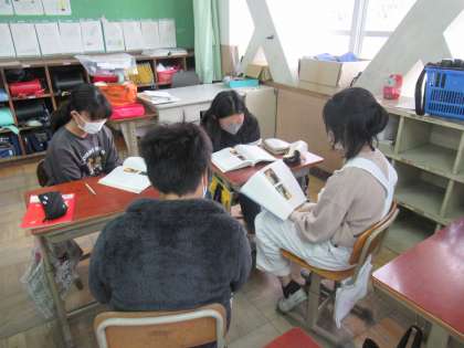 社会の歴史で学習した室町時代に日本で生まれた日本文化の一つ狂言。国語の授業では、その中で「柿山伏」の演目を、声の出し方、間の取り方を工夫して音読発表会を行います。役を決めてペアの友だちと読み合わせをしました。「笑っていることを表すにはどんな声の出し方をすればいいんだろう」と友だちと相談しながら進めています。この後の音読発表会にも期待です。
