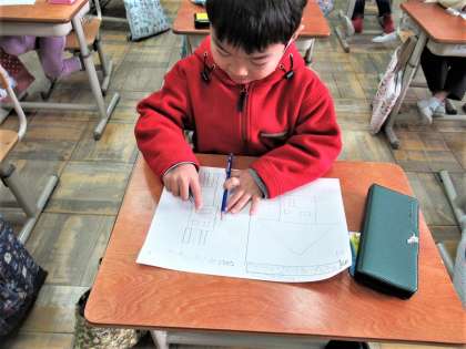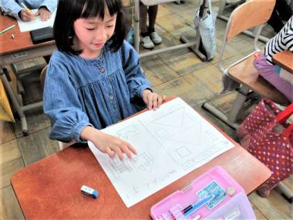 算数科『かたちづくり』の学習では、点と点をつないで絵を描く学習をしました。まっすぐ線を引くことに気をつけながら、△や□を使って家やロボットの絵をかいて楽しみました。