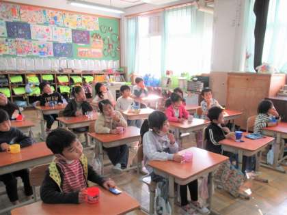 フッ化物洗口が今週から本格実施になりました。ちょっと苦みのあるお薬のため、少し渋い顔をしている子もいましたが、先週の練習のおかげでスムーズに取り組むことができました。