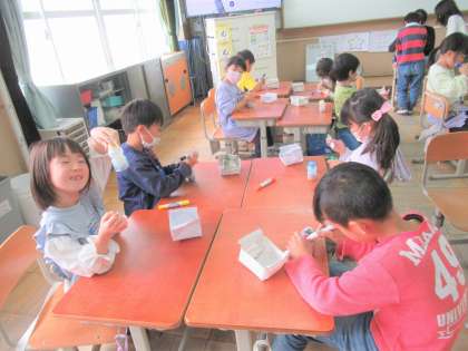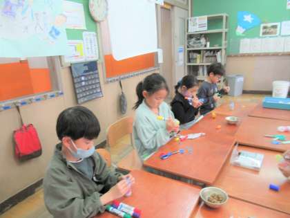 今週の生活科の『あきといっしょに』では、拾ってきたドングリや葉っぱを使って楽器作りをしました。ドングリの大きさや入れる葉っぱによってなる音が違います。友だちと音を鳴らし合って、どんな音が出るか試していました。