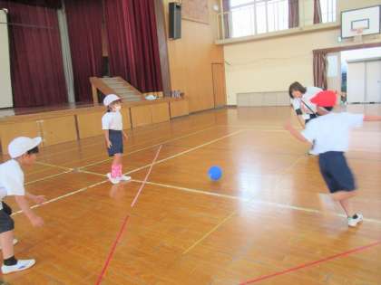 体育科の『ころがしドッジボール』の様子です。何度も練習しているうちに、少しずつよりよい活動の仕方に気が付くようになってきました。ボールを転がすときは早く転がせるように、避ける時はしっかり相手を見て……グループで作戦を立てて頑張っている様子も見られます。