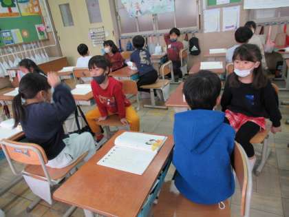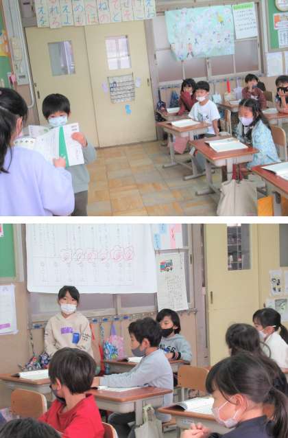国語科『ともだちのこと、しらせよう』は、友だちの楽しいことを聞いて、みんなに紹介する活動をします。初めの学習では、教科書に書いてあるお手本を音読して練習したり、話すときや聞くときに大切なことを発表したりしました。