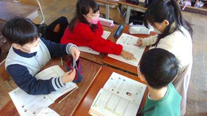 算数では、2つの事柄を一つの表にする学習をしています。教科書の表を見て、どんなことがわかるのか話し合いました。
