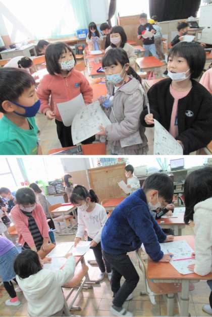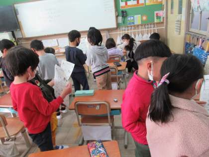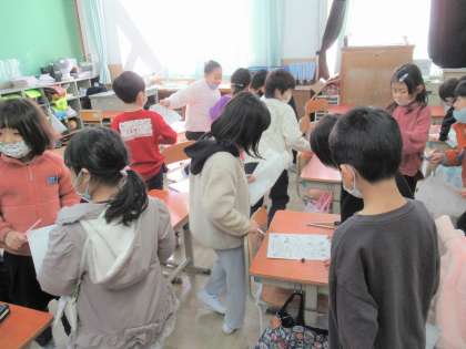 冬休みの振り返りは、久しぶりのアイスブレーキングも兼ねて、「冬休みビンゴ」という形で行いました。自分がしたことを書いて、友だちに聞いてみるという活動です。同じことをした!と喜び合う姿や、もらったクリスマスプレゼントの話で盛り上がる姿も見られました。
