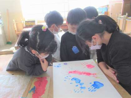 と、大はしゃぎで活動していました。来週の学習では「うつしたかたち」が何に見えるか想像を膨らませて、その上に絵を描いていく予定です。楽しみですね!