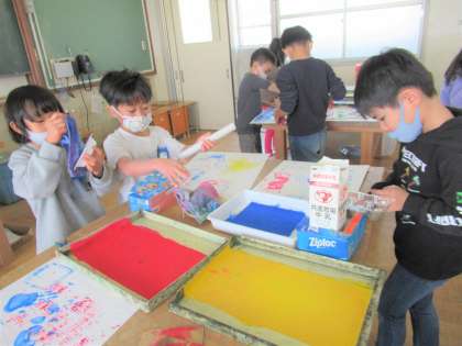 図画工作科『うつしたかたちから』の学習で、版画に取り組みました。洗濯ばさみやペットボトルのふた、野菜の切れ端など、いろいろなものに絵の具をつけてみてペタペタ……。