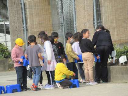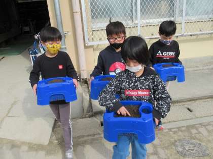 冬休み明けの球根の様子を見に行きました。見ると、少し土が減っている子もいる様子……。どうやらカラスや猫のような生き物が、植木鉢にいたずらをしているようです。球根を守るため、もう一度土をしっかりと被せて、植木鉢の場所を移動しました。