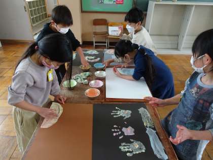 この絵の具はとろっとしているので,立体的にしてみたり,手のひら全部につけてダイナミックに描いたり,指を使ってぐっと伸ばしてみたり,手のいろいろなところを使って仕上げていました。