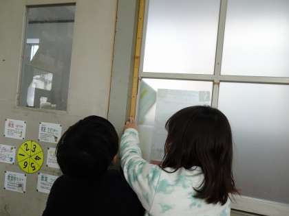 1mという長さに初めて出会い,「教室の中に1mのものはあるかな。」,「ここはいったい何m何cmかな。」と予想したり,100cmものさしを使っていろいろなところを測ったりしました。