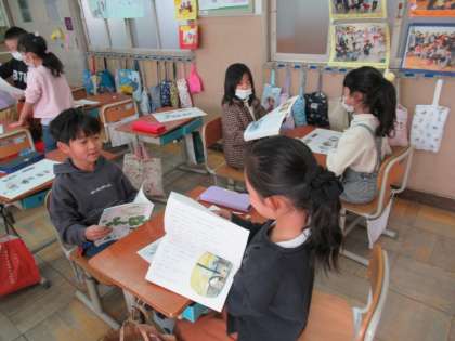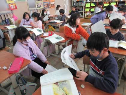 国語科『たぬきの糸車』では、お話の好きなところを見つけて、音読して紹介する学習をしています。写真は『たぬきの糸車』のお話の好きなところを交流している様子です。