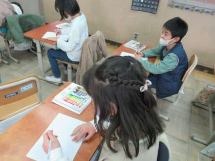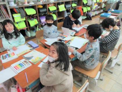 今週は、来年度の1年生の教室に飾る絵のアイデアを出し合って、描き始めました。1年生の思い出や学習を振り返り、どんな絵にしたら1年生の行事や楽しいことが伝わるか一生懸命考えてのびのびと絵を描いています。