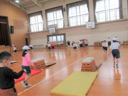 体育科では『とびばこあそび』の学習に入りました。1年生では、リズムよく跳んだり台に乗っていろいろな方法で跳び下りたりすることを楽しむ活動から学習が始まります。