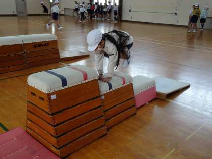 はじめは跳び箱に対して恐怖心を持っている子もいましたが,今はどんどんチャレンジする姿が見られています。「はじめはできなかったけどできるようになった。」「踏切を思いっきりやると,うまくいったよ。」と嬉しそうに話していました。