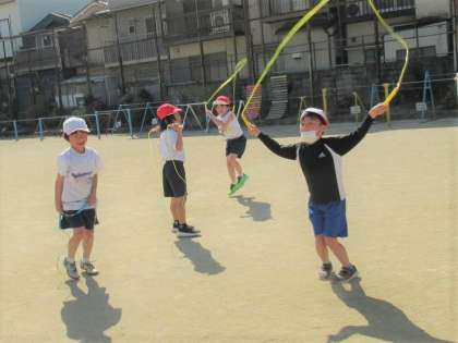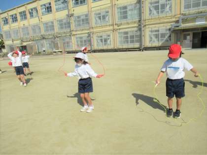 体育の学習で縄跳びをしました。前に行った時より、とっても上達している子が多くいました。家でも練習したり、教えてもらったコツを実践したりして、一人一人がレベルアップのために練習中です。中には友だちと一緒に跳んだり、新しい技を開発したりして楽しんでいる様子も見られました。