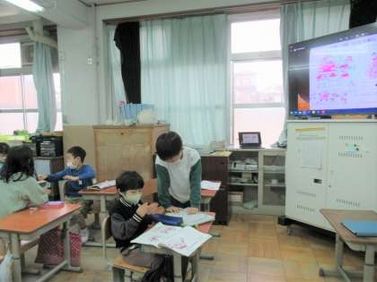 今年度最後の安全の学習は、『自動車と人(2)』についてでした。安全ノートには、車の前に急に飛び出す子どもや、道路でボール遊びをしている子どもたちの絵が描かれていて、どんなところが危ないかについて考えていきました。