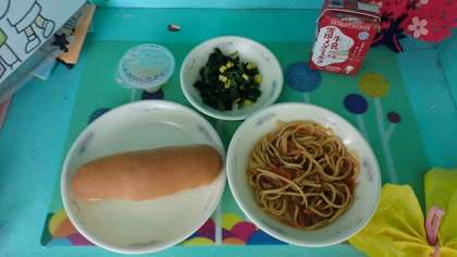1年ではじめの献立は、子どもたちの大好きな「スパゲティのミートソース煮」と「ほうれん草のソテー」です。久しぶりの給食を、子どもたちは朝から楽しみにしていました。スパゲティは、ゆで具合が抜群で、トマト味のミートソースと相性ぴったりでした。「ほうれん草のソテー」は、コーンが入って色どりもよく、とてもおいしくいただくことができました。