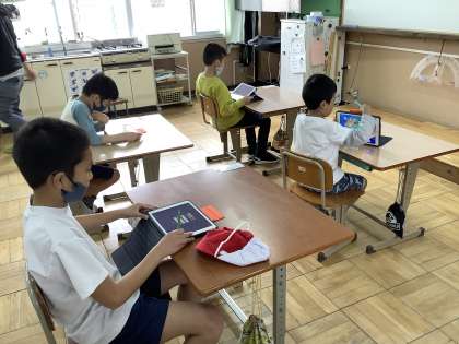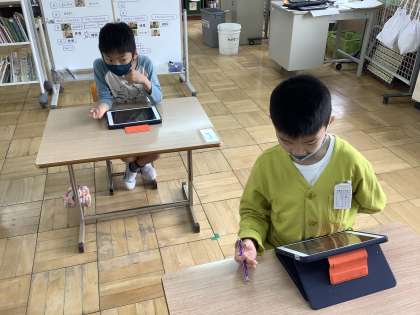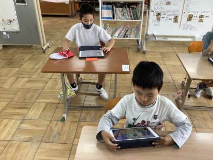 一人一台のiPadを使って、学習を進めています。自画像を描くときにはタブレットで写真を撮り、画像を見ながら描きました。4、5年生は暗算マンというアプリをよく使い、計算の練習を楽しく進めています。