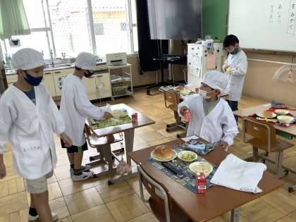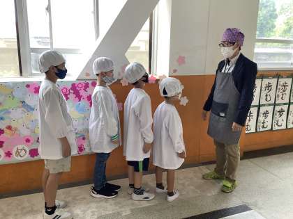 給食当番では、4・5年生が中心となって給食の準備や手洗いの仕方、エプロンのことを教えてくれています。並ぶときには、1年生を先頭に上手に並んで給食室へ行きます。今年度は、学期ごとに当番を決めて最後までやりきることを目標に取り組んでいます。